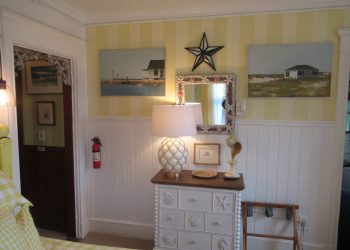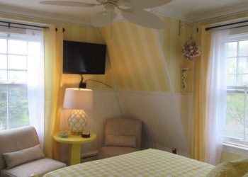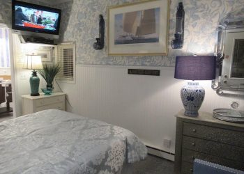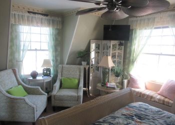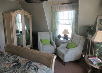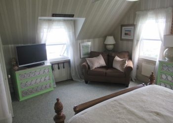 The Victoria-Ruth, on our third floor, is also a front corner room with all windows enjoying a panoramic view of the Atlantic Ocean with some of the greatest sun rises seen over the ocean!  Finished in pale pastel shades of green, white and lavender with a queen size bed and a twin pull out sofa. There is a mini refrigerator and a 32” flat screen TV along with a full-size bath with a shower plus an air conditioner and wireless internet access. The Victoria-Ruth is a very comfortable room with views that can’t be beat!