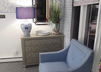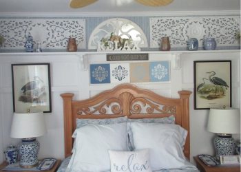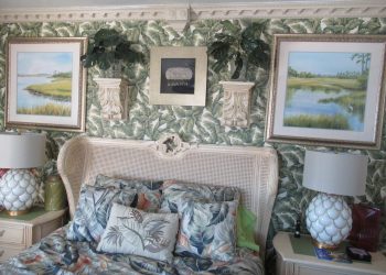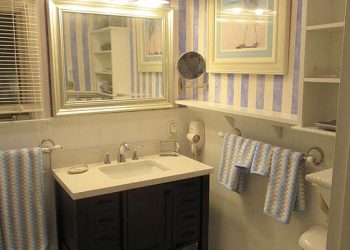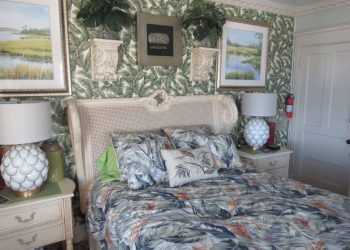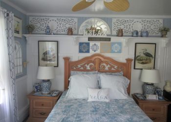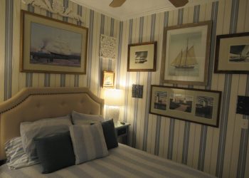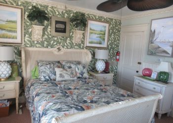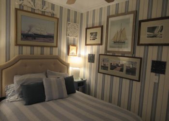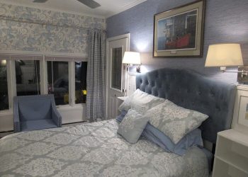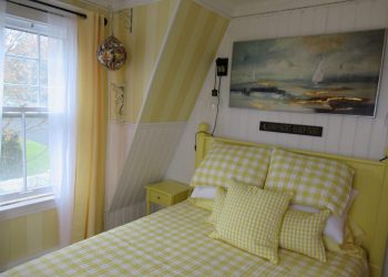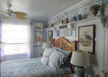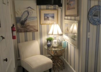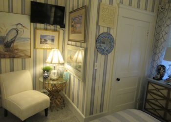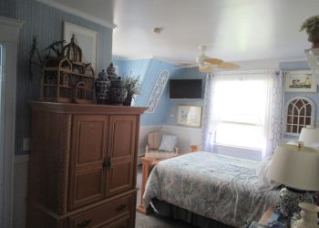 Soothing Blue & White deco by the Sea, this is a small room but has all the amenities like all of our rooms.This room is located on the ground floor for those who can’t do many stairs.  It has a Queen Size Bed,an upholstered chair, a dresser,  nautical art work, private bath, TV, air conditioner, mini-fridge and wireless internet.