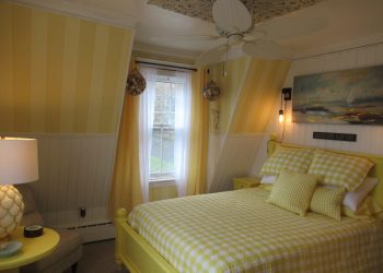 Located on the second floor of the Inn, this ocean view room is finished in soothing shades of yellow and white.  Very beachy in looks with sea-shell motif dresser and nightstand.  Two side chairs in beige complete the décor of the Alf-Fred.  Tastefully done without heavy accent pieces.  Enjoy the Atlantic Ocean from the queen size bed in this room.  The Alf-Fred has its own private bath for your comfort with a shower with a nice water pressure shower head.  Top of the line retro lighting complete the over all appearance of the Alf-Fred plus a mini refrigerator for food, drinks or medications.  There is also a 32” flat screen TV, air conditioning during the warmer months and wireless internet access.