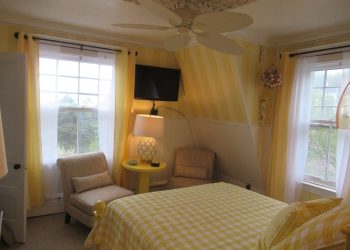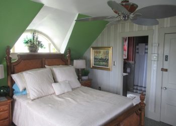 Located on the second floor of the Rockmere, this room is decorated with blue, and white.  The queen size bed along with two whitewashed Upholstered armchairs finish the total look of a seaside feeling at the Rockmere. A full bath with shower completes this guest room. A mini Refrigerator is also available in this room for your convenience.  It also has a 32” flat screen TV for your viewing pleasure plus air conditioning and wireless internet access.