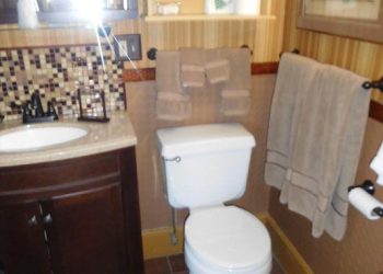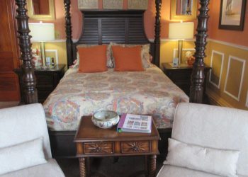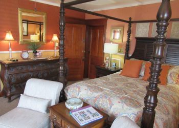 Being the largest of the Rockmere guest rooms, this second-floor room blends salmon, white and gold in the décor color scheme.  The Beverly-Mae offers a queen size upholstered bed plus a twin-size pullout leather sofa when needed along with a leather upholstered chair alongside a reading lamp.  The furnishings are French Provincial from Dexter Heritage making the front ocean view room very desirable for a relaxed vacation stay at the Rockmere.  A full bath with shower completes the Beverly-Mae room.  It also has a mini refrigerator and a 32” flat screen TV for your viewing pleasure plus air conditioning during the warmer months and wireless internet access.