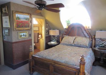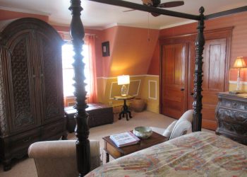 Located on the third floor of the Rockmere, this front ocean view room is decorated in shades of burgundy, gold white and green.  The Ethan Allen queen size Victorian High Back carved bed will make you fell like Royalty sleeping in it!  A marble top dresser and side upholstered chair complete the furniture along with a pull-out twin-size leather ottoman bed.   There is also a 32” flat screen TV and a mini refrigerator in this room plus air conditioning during the warmer months and wireless internet access.  There is a full bath with a tub and shower included in this room.